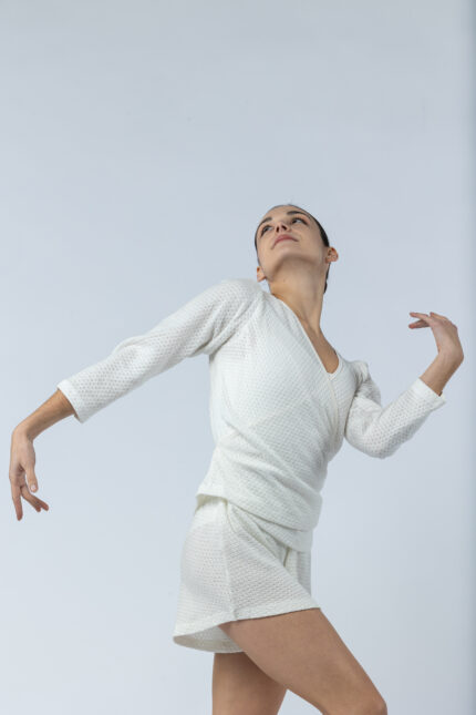 The Maya wrap top, with its flowing lines, accompanies the dancer in chic cocooning, ideal for warm-ups or relaxation.