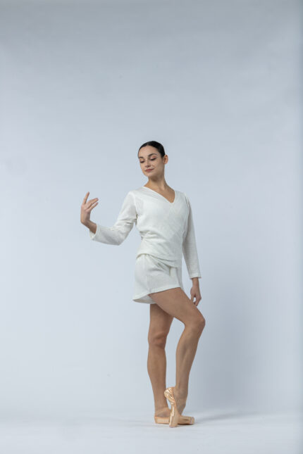 Le cache-cœur Maya, avec ses lignes fluides, accompagne la danseuse dans un cocooning chic, idéal pour des moments d’échauffement ou de détente.