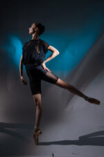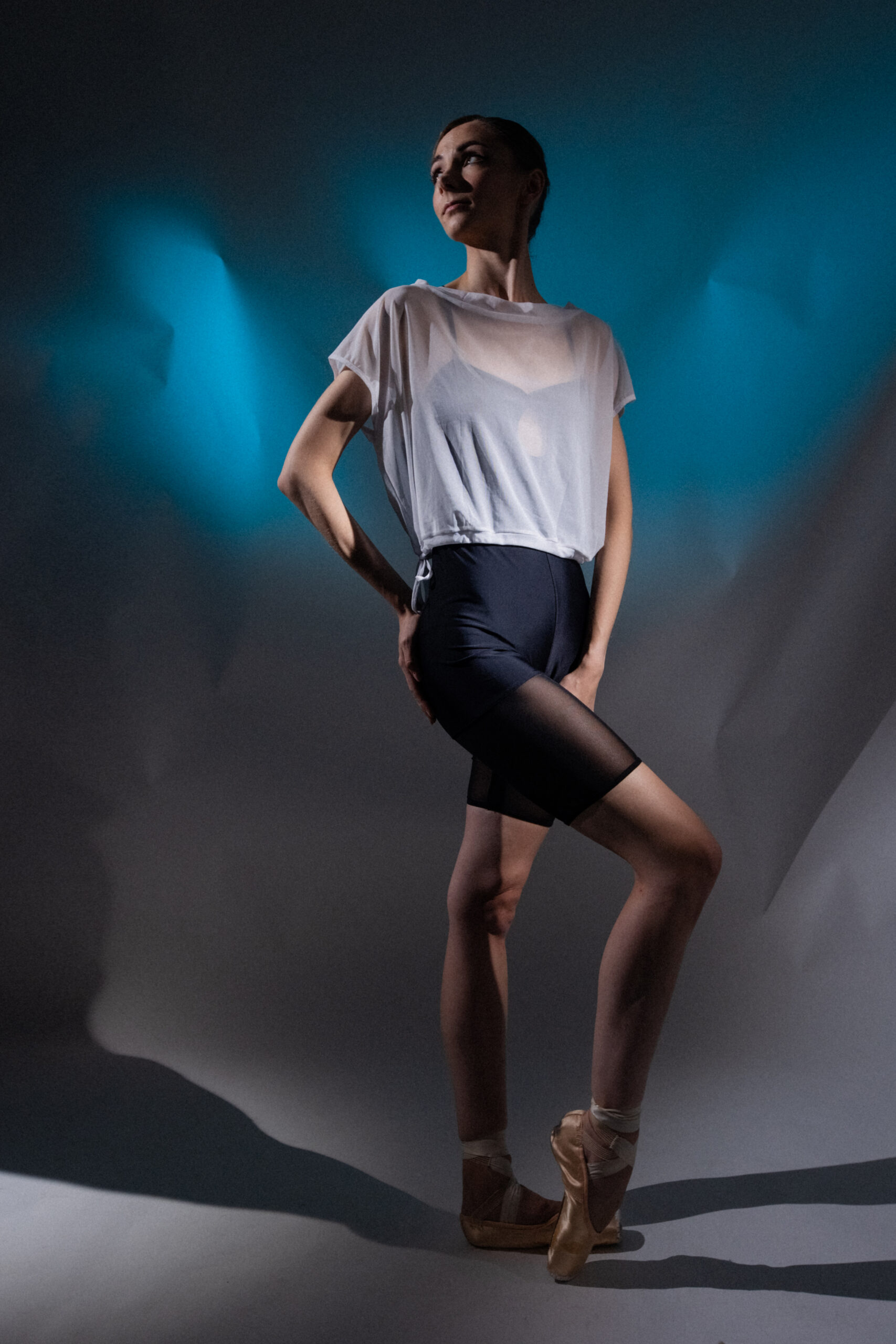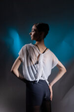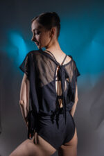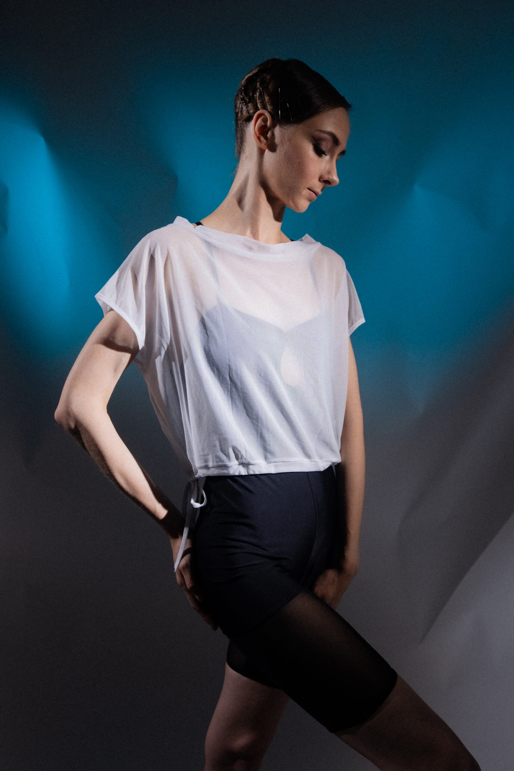 Short-sleeved fishnet top with boat neck, tied at the back with a scarf-style tie and tightened at the waist with a tonal satin braid