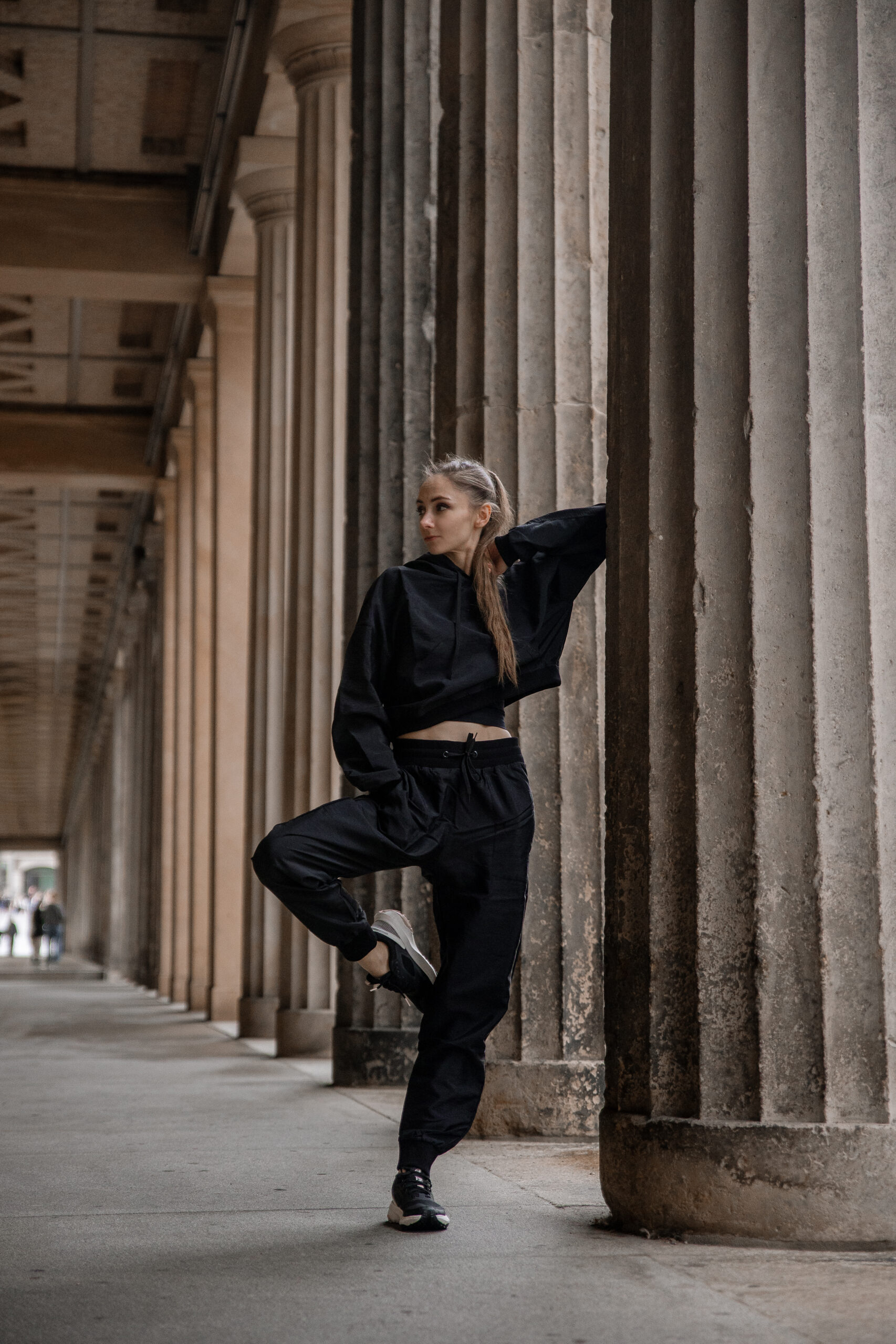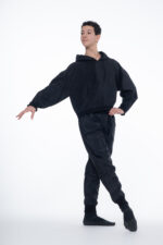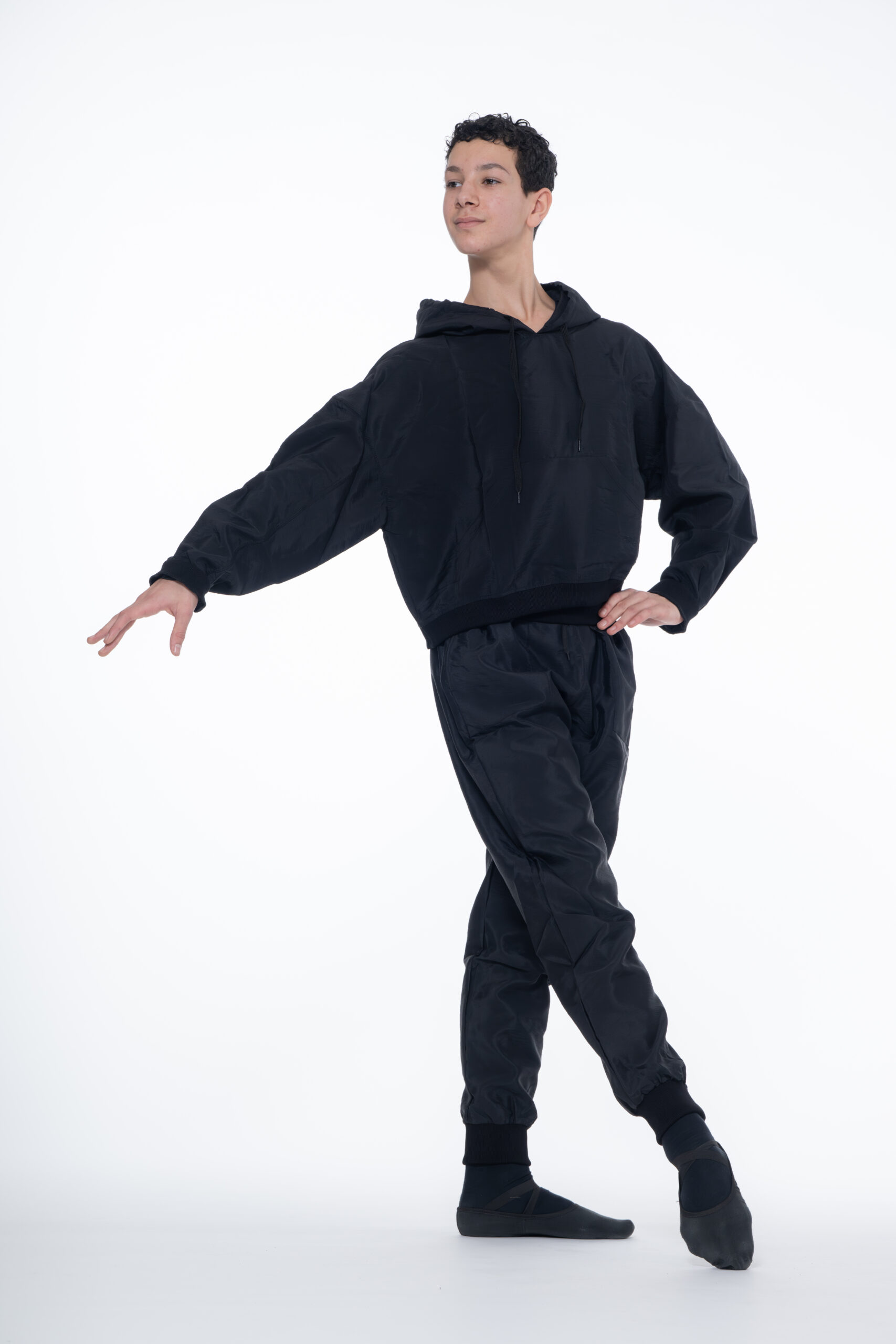 It is tightened at the waist and ankles by a 1×1 rib edge.