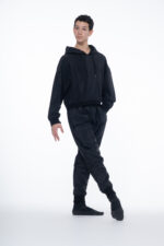 The cuffs and belt are tightened by a 1×1 rib edge.