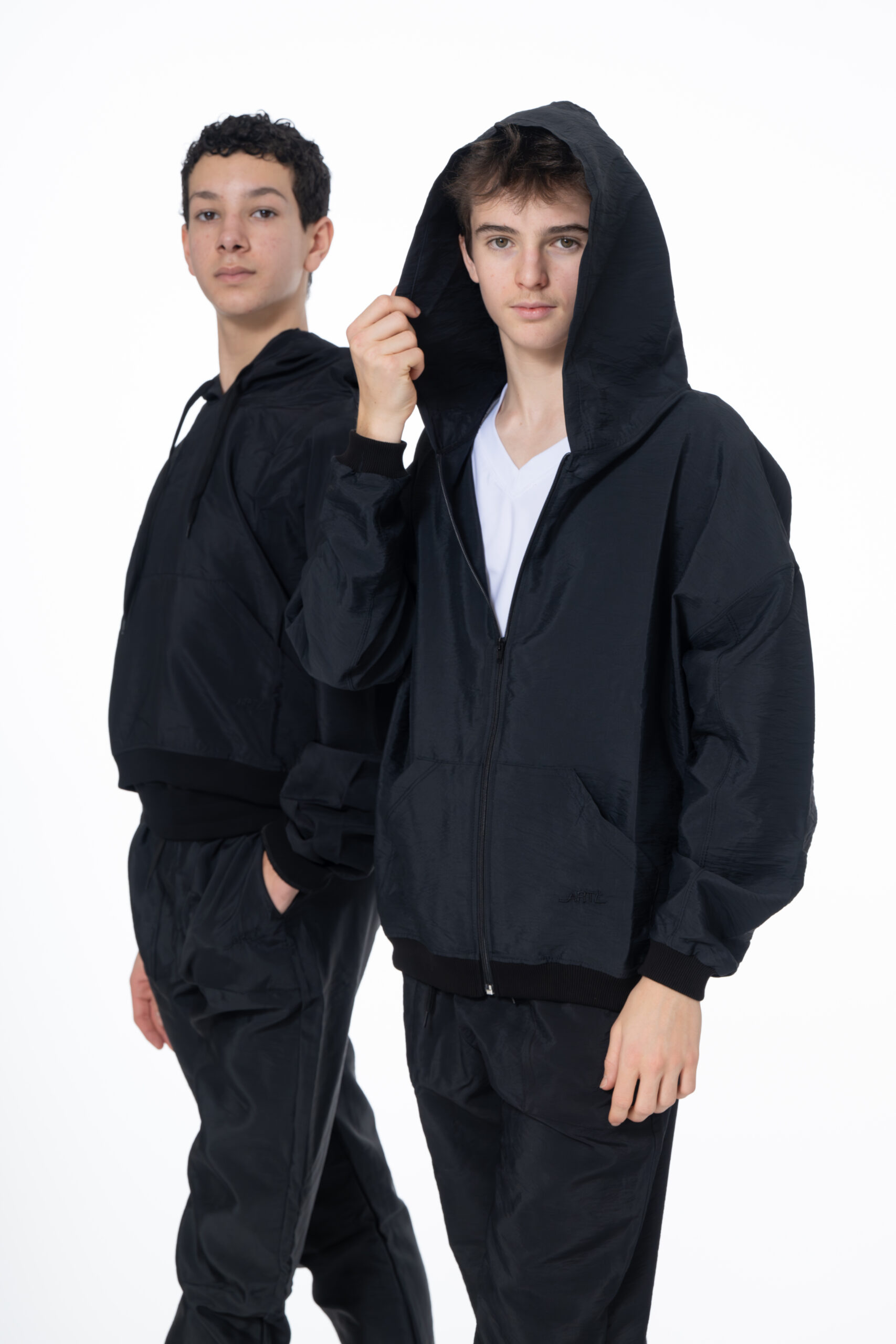 UNISEX hooded jacket with kangaroo pocket and loose front zip.